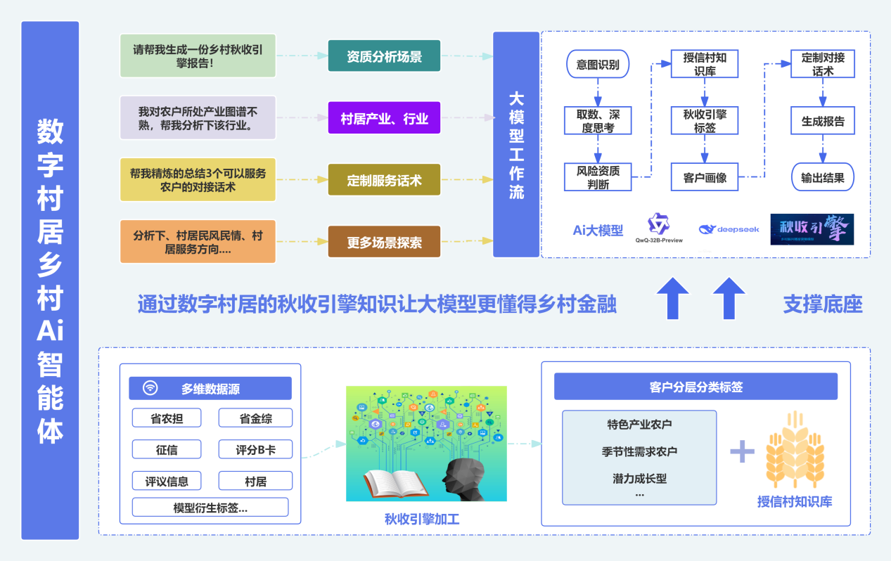 AI智能體賦能。“秋收引擎”打造了專屬涉農信貸AI智能體,集成大模型對話功能。客戶經理可通過自然語言交互,獲取村居特色產業、農戶資質“畫像”、農業產業鏈等結構化知識,并精準識別不同農戶群體在不同時期的金融需求,提供定制化的營銷與服務推薦,大幅提升涉農金融服務精準度和效率。
