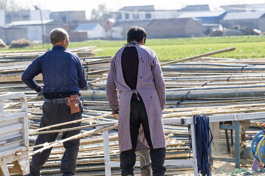 合作社設(shè)有運(yùn)輸部、植保技術(shù)部、勞務(wù)部、信息部、物資部等十幾個(gè)部門,各負(fù)其責(zé),組織社員從建棚、種植、銷售等方面開展一系列生產(chǎn)經(jīng)營工作。這是社員們正在動(dòng)手破竹子建冷棚。