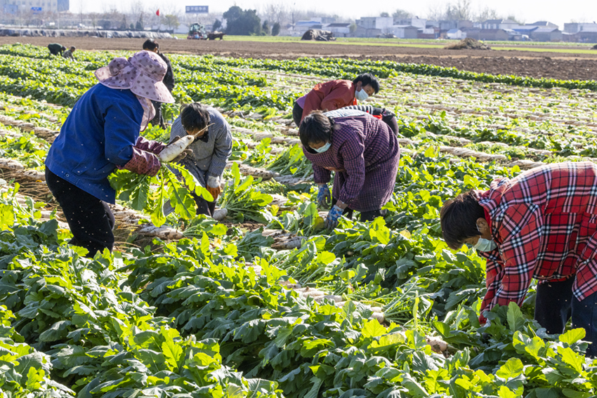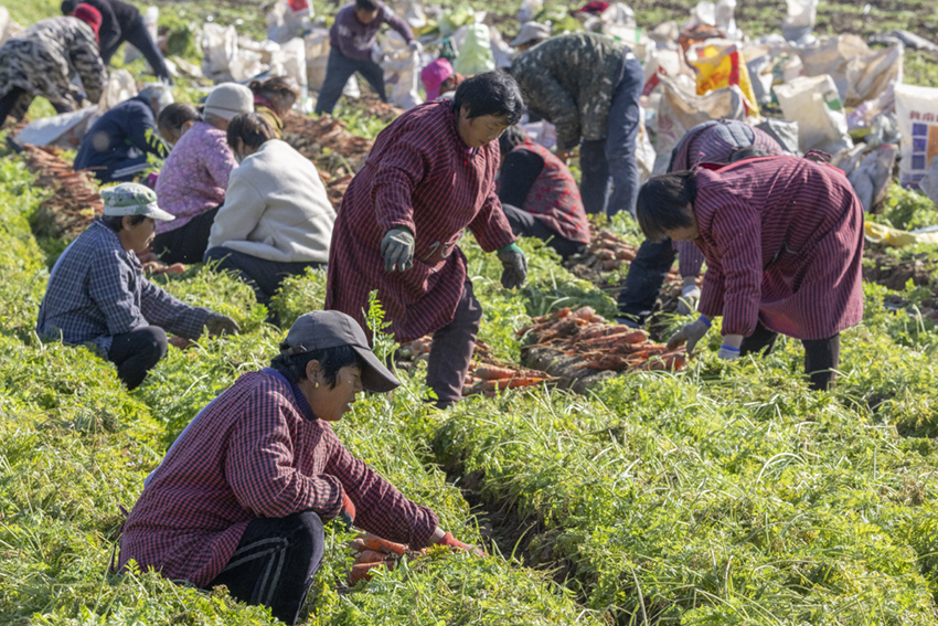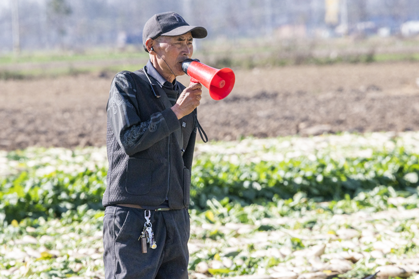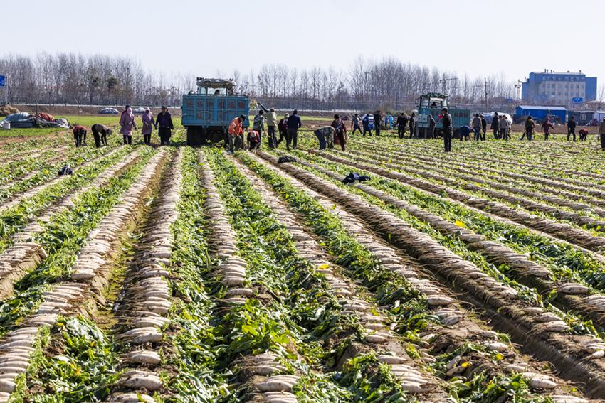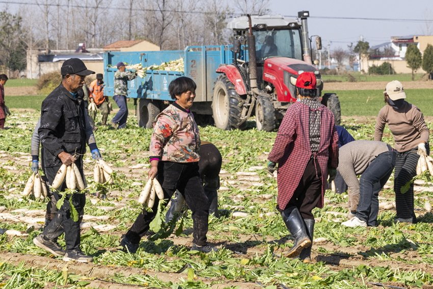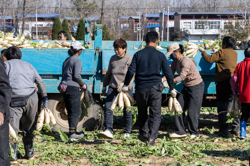這里的農(nóng)民干勁很足。他們腳下散落著蘿卜葉,泥土里裹滿豐收的喜悅和人間煙火氣。