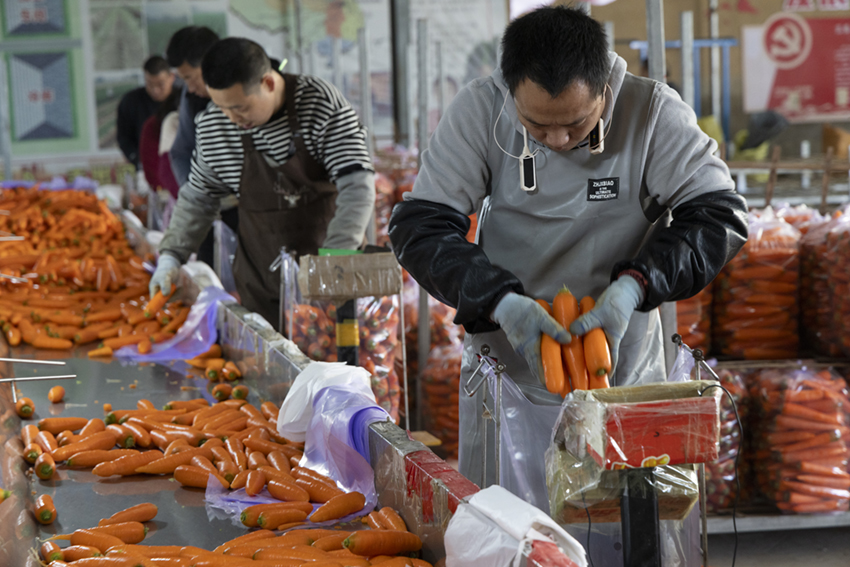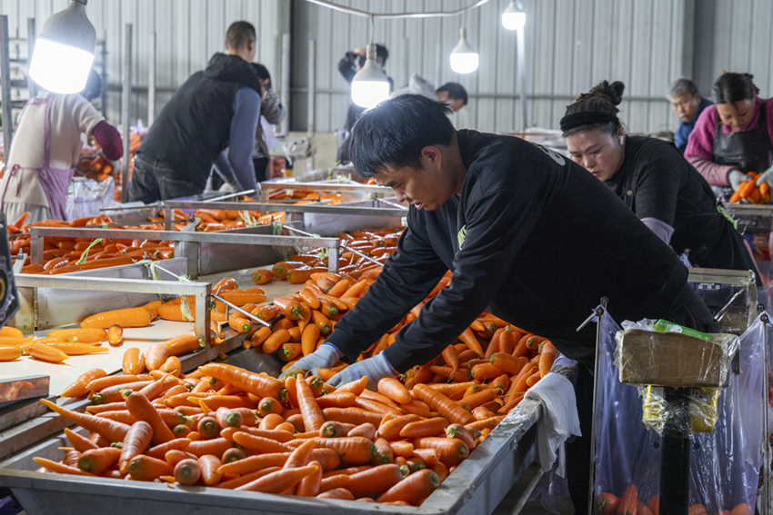 合作社洗蘿卜的車間里機(jī)器轟鳴,洗過的胡蘿卜顏色特別鮮亮。
