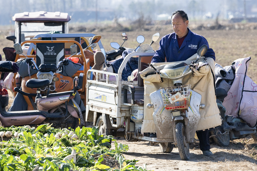 蘿卜地頭停放著很多三輪車。村民給合作社務(wù)工,在家門口就有可觀的收入。