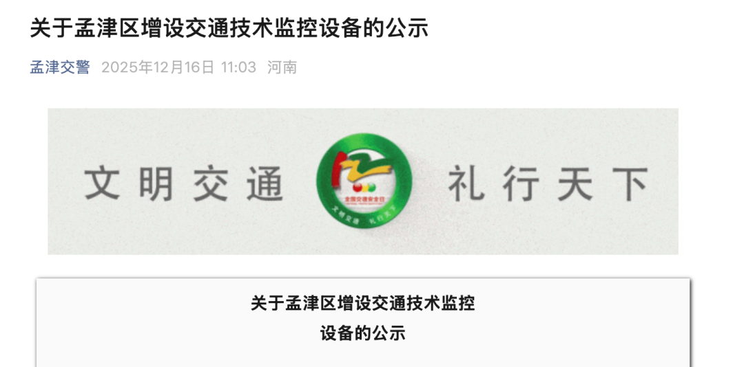 為加強道路交通安全管理,預防和減少道路交通事故,根據《中華人民共和國行政處罰法》《中華人民共和國道路交通安全法》等法律法規規定,洛陽市公安局交通管理支隊勤務八大隊在孟津區增設交通技術監控設備,用于查處車輛違反信號燈通行、逆向行駛、違反禁止標線指示、不按導向車道行駛、違反禁令標志指示等違法行為,公示日期為:2025年12月16日至2025年12月22日,2025年12月23日起開始啟用。