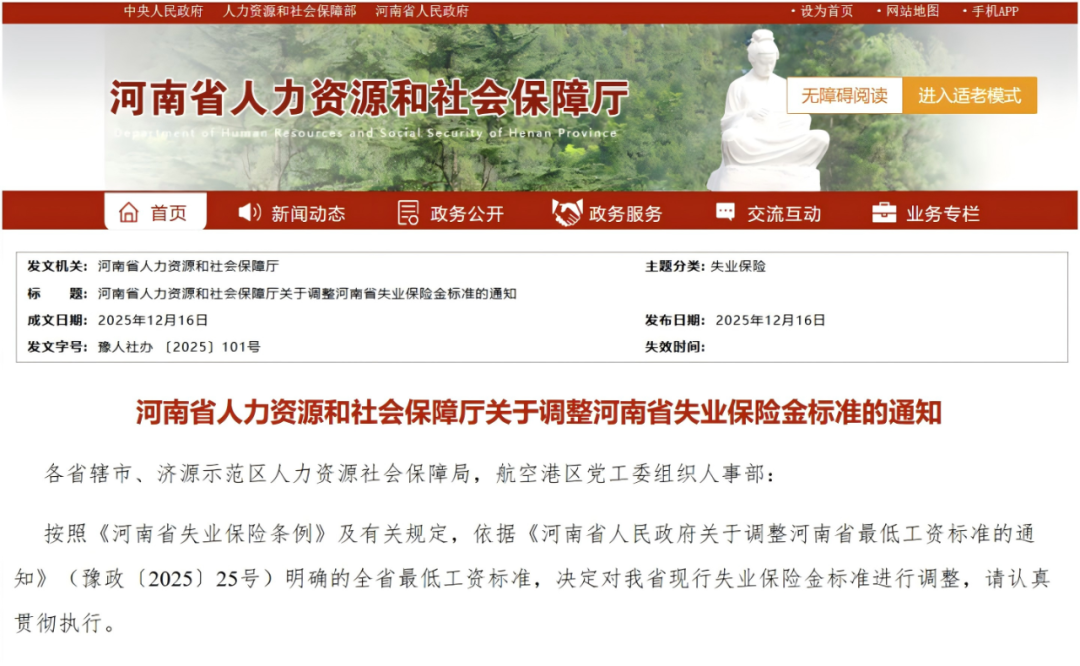 12月16日,河南省人力資源和社會保障廳發布通知,對河南省現行失業保險金標準進行調整。調整后的失業保險金標準從2025年12月1日起執行。