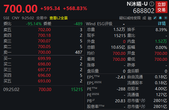 沐曦股份上市首日高開(kāi)568.83%,報(bào)700元/股,市值達(dá)2801億元,按開(kāi)盤(pán)價(jià)計(jì)算,中一簽可賺29.77萬(wàn)元,超過(guò)摩爾線程(28.69萬(wàn)元)。