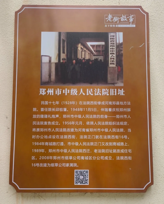 法院街的得名,源于1928年建成的河南鄭縣地方法院。在新中國成立后,鄭州市中級人民法院還在舊時鄭縣地方法院的樓內辦公,直至20世紀90年代遷走,鄭縣法院舊址也不復存在。不過在舊址的北部,后來新建起了管城回族區人民法院,面朝商城路,背靠法院西街,呈坐南朝北坐落:它背靠歷史,面向未來,守護著市井的煙火。