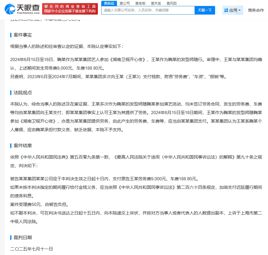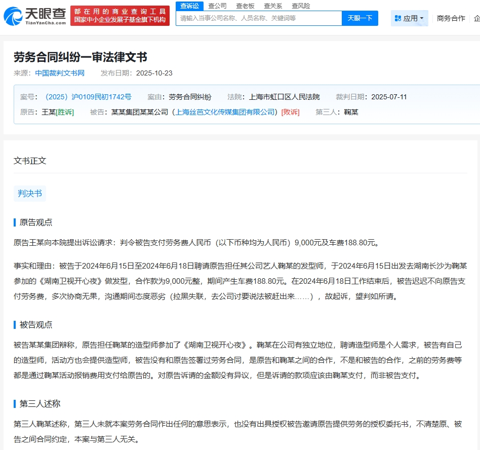 天眼查天眼風(fēng)險信息顯示,近期,法院公開王某與上海絲芭文化傳媒集團有限公司勞務(wù)合同糾紛裁判文書。原告王某訴稱于2024年6月15日至6月18日受被告聘請擔(dān)任其公司藝人鞠婧祎的發(fā)型師,為其參加的活動做發(fā)型。工作結(jié)束后,被告遲遲不向原告支付勞務(wù)費,多次協(xié)商無果,溝通期間態(tài)度惡劣(拉黑失聯(lián),去公司討要說法被趕出來),故起訴。