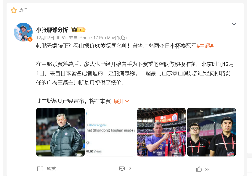 “土帥成績亮眼,卻遭名帥“截胡”,山東泰山這是豪賭還是遠見?”??韓鵬帶隊?wèi)?zhàn)績佳,山東泰山卻仍想邀世界名帥斯基貝,千萬歐元年薪引關(guān)注,同時神戶勝利船也虎視眈眈,這波操作值嗎?選帥別只看名氣!得綜合考量執(zhí)教風(fēng)格、戰(zhàn)術(shù)理念與球隊適配度。山東泰山若真想沖冠,得確保斯基貝能融入球隊,別讓高價成“冤枉錢”。山東泰山這波操作爭議大,土帥韓鵬難道真不如外來名帥?不過斯基貝履歷確實牛,帶隊成績有目共睹。但足球不是名帥就一定能贏,還得看團隊配合。你們支持山東泰山拿下斯基貝嗎?覺得能奪中超冠軍嗎?評論區(qū)聊聊!??#2025新星計劃4期#