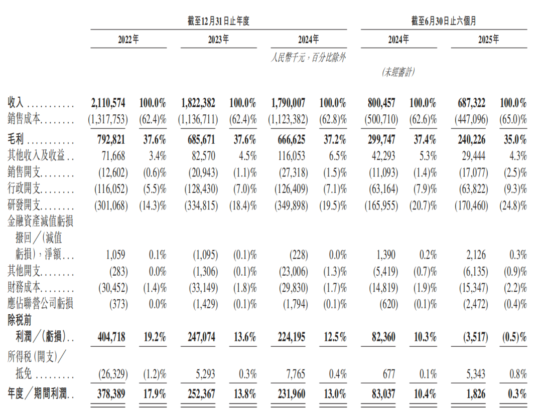 多個“全球第一”加持,但富瀚微的營收近三年確呈現下降趨勢。2022年-2024年以及2025年1-6月(簡稱:報告期),富瀚微的營業收入分別為21.11億元、18.22億元、17.90億元、6.88億元,同期凈利潤分別為3.78億元、2.52億元、2.32億元、182.6萬元。