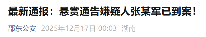 12月17日,湖南邵東市公安局發布最新通報:邵東市公安局12月14日發布懸賞通告追捕的犯罪嫌疑人張某軍(男,漢族,43歲)已于12月16日21時許投案。目前,案件正在進一步偵辦中。感謝社會各界和廣大人民群眾對公安工作的大力支持。