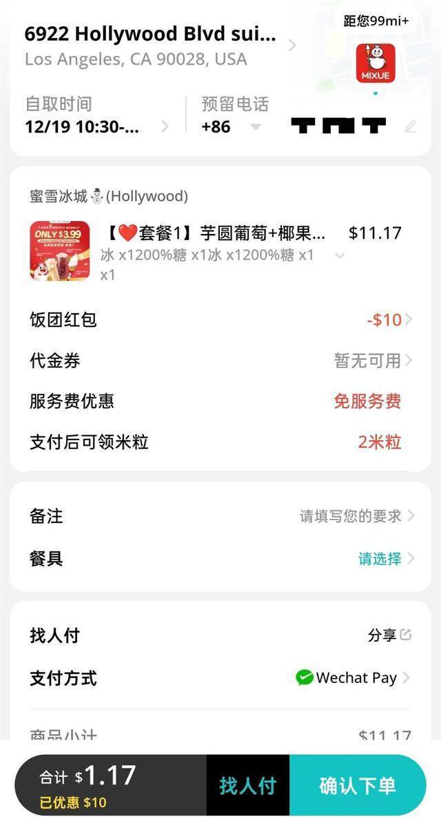值得一提的是,線下門店尚未正式營業,但外賣平臺已經可以提前點單了。飯團外賣APP顯示,美國版蜜雪冰城共有兩個套餐,都是兩杯奶茶/果茶,外加一個冰激凌,售價3.99美元(約合28元人民幣),有8種甜度可選,從不另外加糖到200%糖。12月19日至21日,消費者可到線下核銷領取,支持微信支付寶支付。
