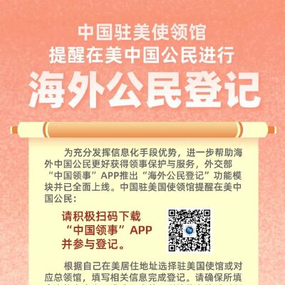 中國駐美國使領(lǐng)館提醒在美中國公民:請(qǐng)積極掃碼下載“中國領(lǐng)事”APP并參與登記。