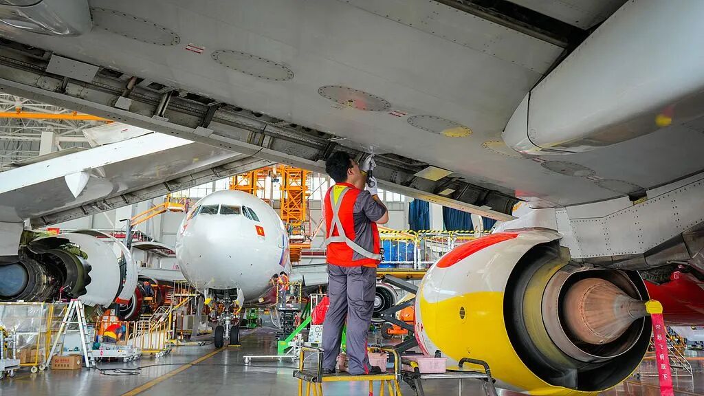 △2025年9月23日,海口,海南自貿港一站式飛機維修產業基地機庫,機務維修人員對飛機進行檢修。
