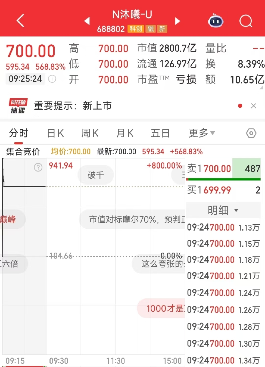 【大河財立方消息】12月17日,沐曦集成電路(上海)股份有限公司(證券簡稱:N沐曦-U)在上交所科創板掛牌上市。開盤大漲568.83%,報700元/股,總市值2800.7億元。按開盤價計算,中一簽可賺29.77萬元。