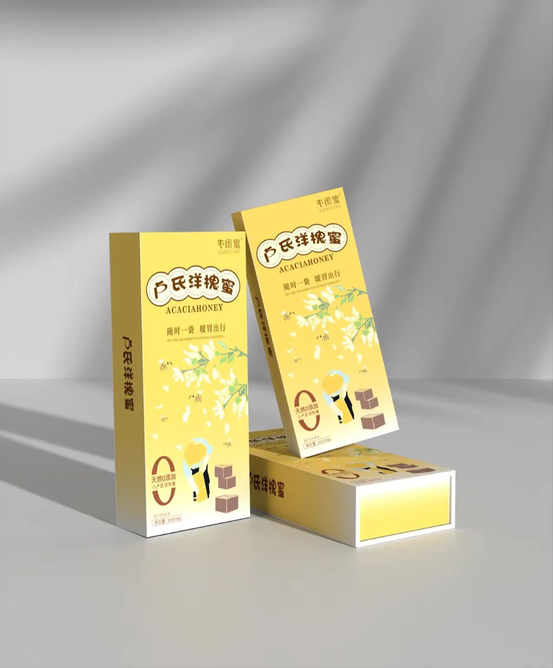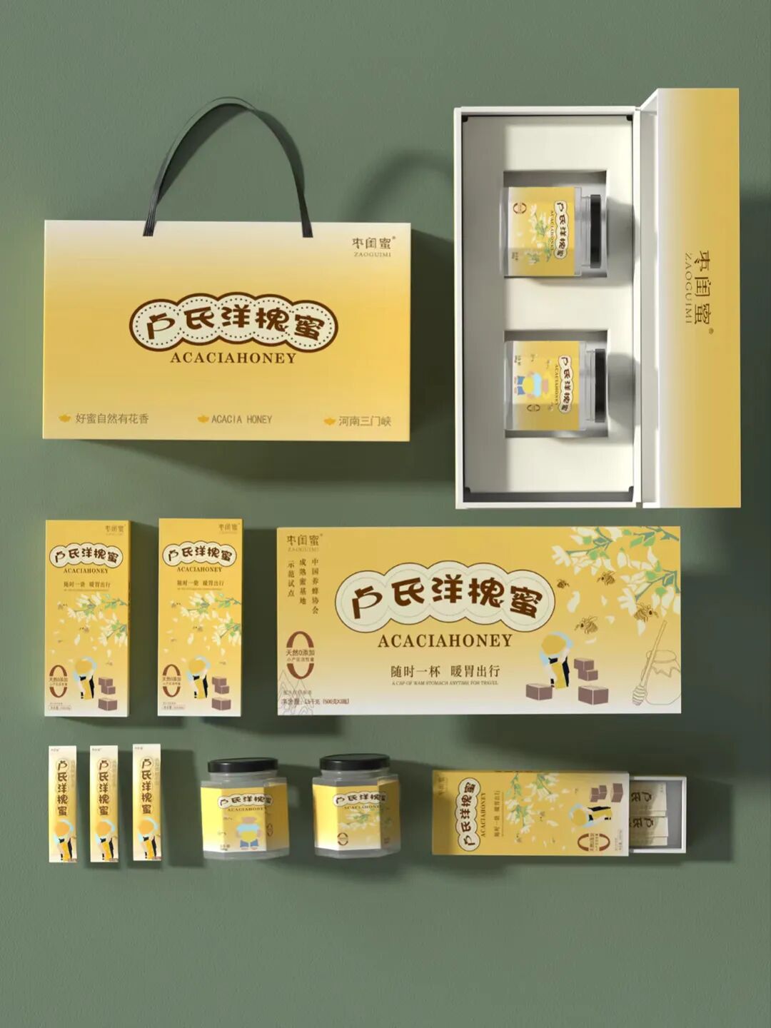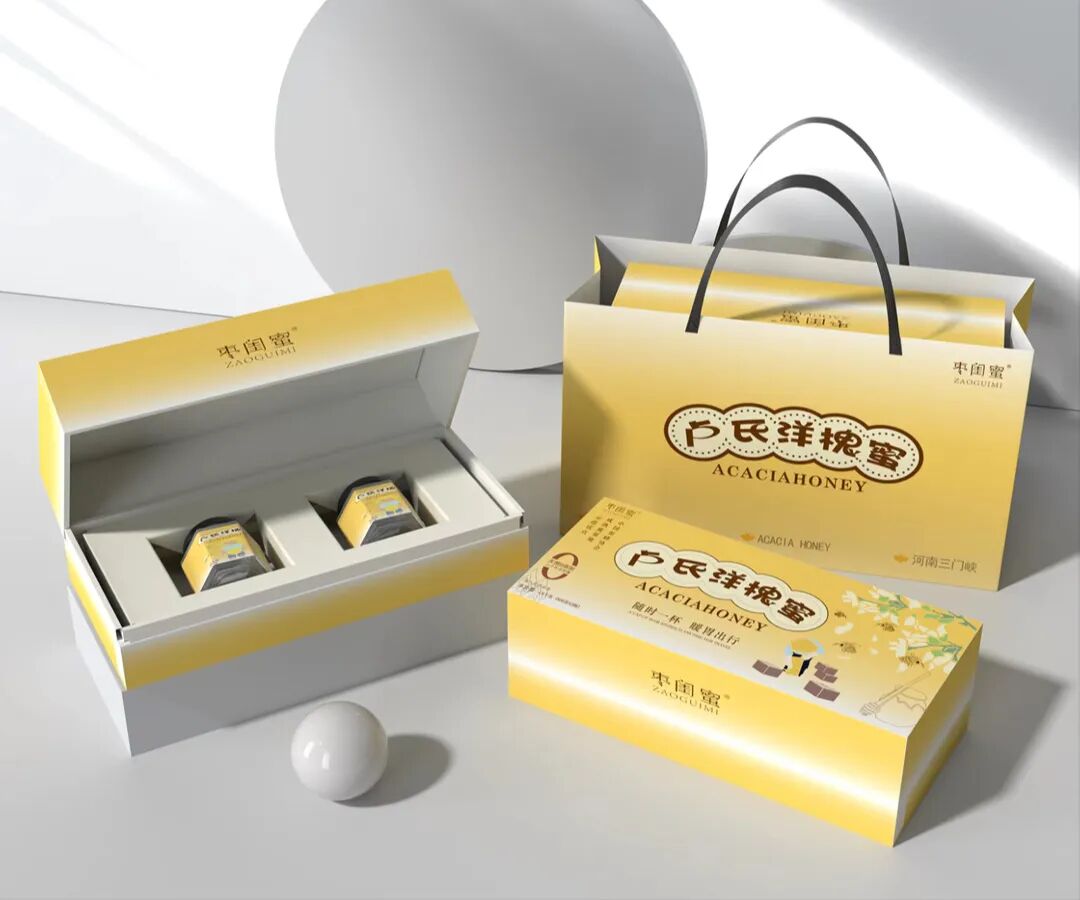 這套洋槐蜜包裝設計以黃色為主色調,寓意著蜂蜜的自然、純正與甜蜜。黃色的選擇能夠迅速吸引消費者的目光,給人一種溫暖且愉悅的視覺體驗。在包裝上還搭配了一些與蜂蜜相關的圖案元素,如蜜蜂、花朵等,這些元素巧妙地融入設計中,進一步強化了產品的天然屬性,使消費者能夠直觀地聯想到洋槐蜜的來源和純正口感。整體設計在視覺上和諧統一,兼具實用性與美觀性。
