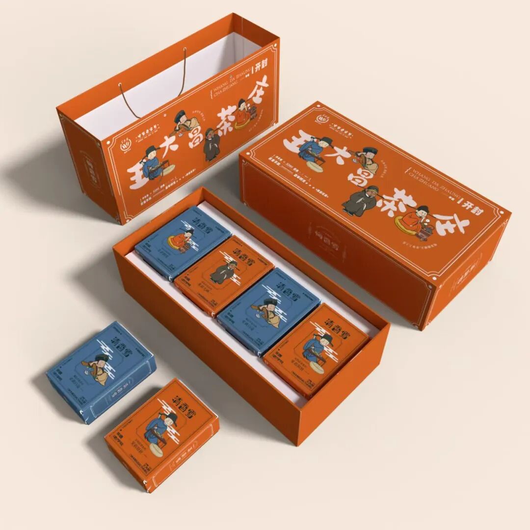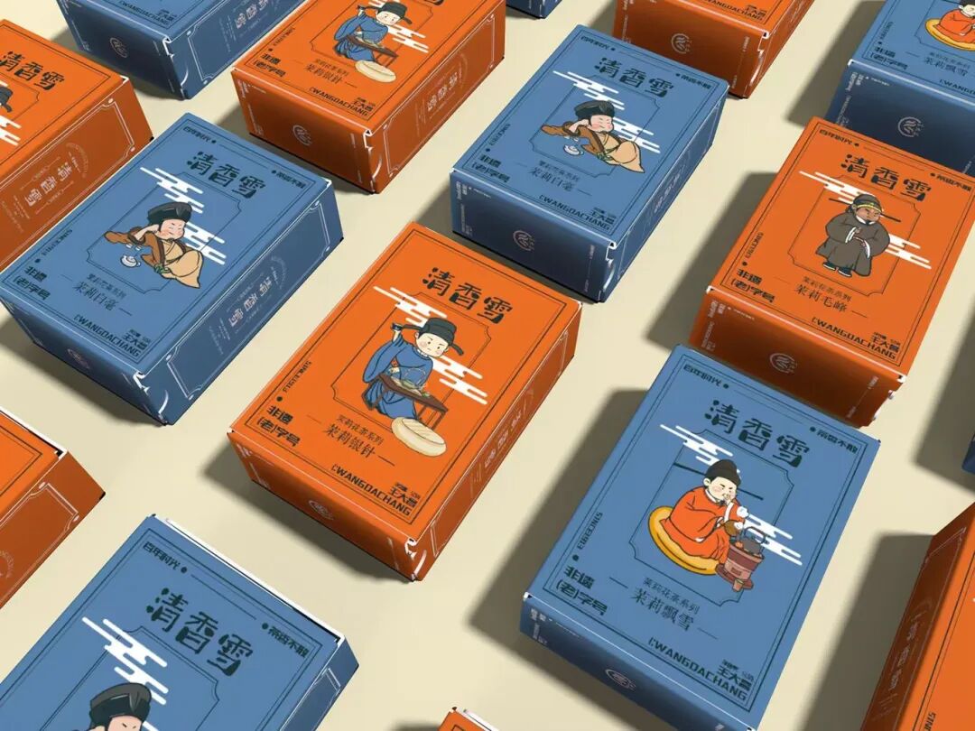 該包裝是以開封非遺王大昌茶莊為題材,融合了傳統(tǒng)與現(xiàn)代元素,既有古代人物插畫的傳統(tǒng)文化韻味,又有現(xiàn)代簡潔的排版與色彩運用,這種設(shè)計風(fēng)格能夠強調(diào)出品牌文化的主題信息,又能夠吸引不同年齡段的消費者。整體以橙色和藍色為主色調(diào),這種顏色能夠吸引眼球傳遞一種熱情友好的感覺,非常適用于茶文化。插畫設(shè)計以四個開封歷史人物(崔浩,蘇軾,包拯,趙光義)穿著古代服飾,姿態(tài)各異為背景,與王大昌茶莊字體相互穿插,增加了包裝的趣味性和故事性,插畫風(fēng)格簡單富有傳統(tǒng)韻味,傳達出茶葉的歷史悠久和開封的文化底蘊。