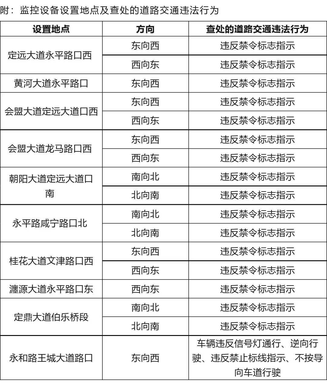 現(xiàn)向社會(huì)公示監(jiān)控設(shè)備設(shè)置地點(diǎn)及查處的道路交通違法行為,希望廣大群眾自覺遵守交通法規(guī),共同維護(hù)道路交通秩序。