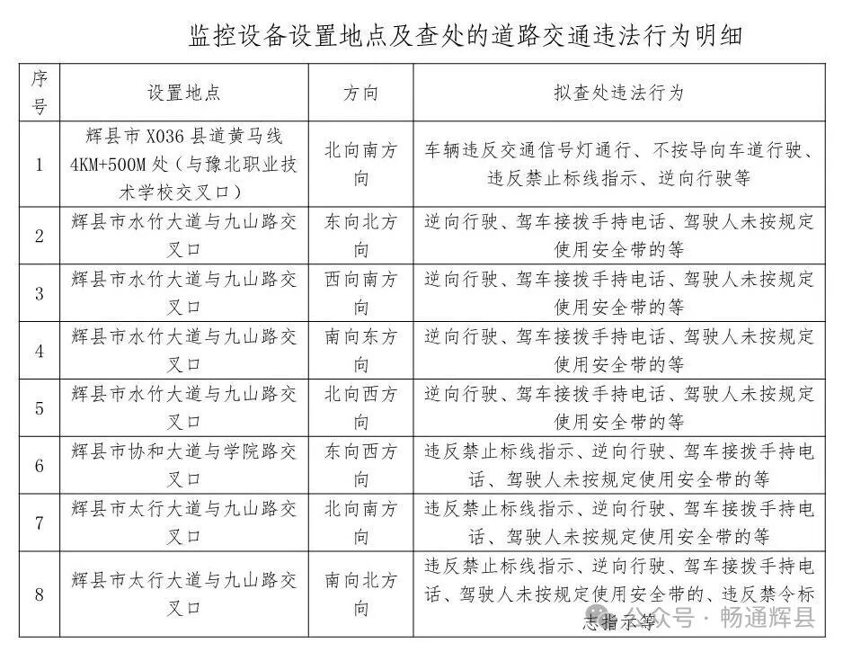 為進一步規范交通秩序,加強道路交通安全管理,預防和減少道路交通事故,促進市民文明出行,根據《中華人民共和國道路交通安全法》、《中華人民共和國道路交通安全法實施條例》、《河南省道路交通安全條例》、《道路交通安全違法行為處理程序規定》等有關規定,經上級主管部門批準,輝縣市公安局交通警察大隊在轄區內4個路口新增8處交通技術監控設備抓拍各類交通違法行為。新增交通技術監控設備自2025年12月25日起正式啟用,現向社會公示交通技術監控設備設置地點及查處的道路交通違法行為,希望廣大群眾自覺遵守交通法規,共同維護道路交通安全和通行秩序。