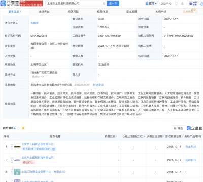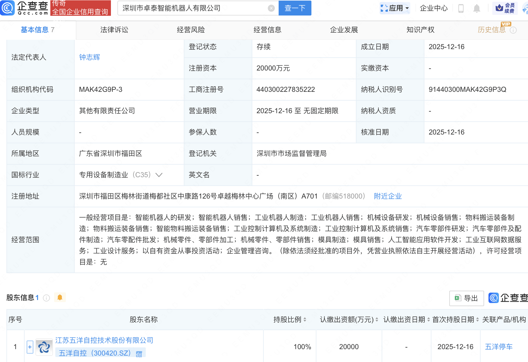 企查查APP顯示,近日,深圳市卓泰智能機器人有限公司成立,注冊資本2億元,經營范圍包含:智能機器人的研發;智能機器人銷售;人工智能應用軟件開發;工業互聯網數據服務等。企查查股權穿透顯示,該公司由五洋自控(300420)全資持股。