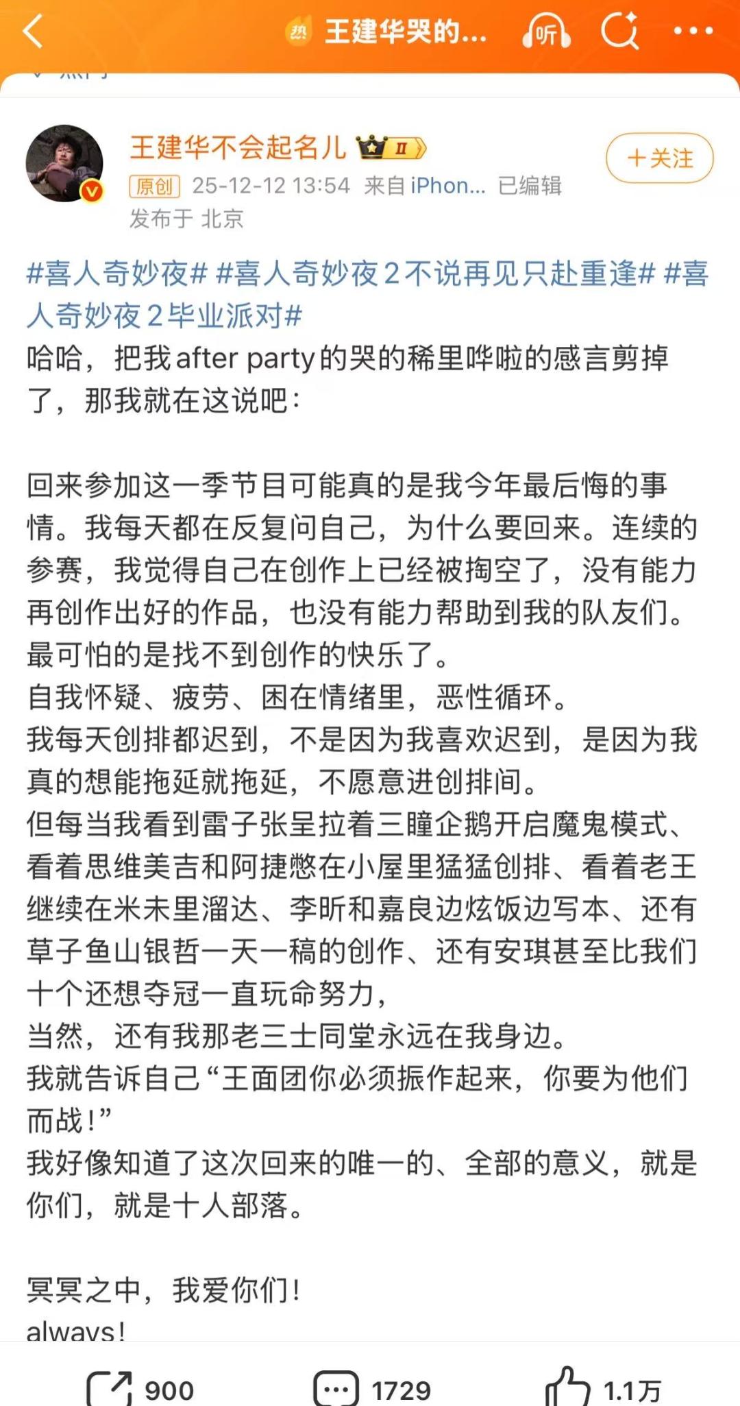 觀眾渴望輕松愉悅的內容,但創作者的“被掏空”是實在的,《喜人奇妙夜2》收官后,王建華在今日(12月12日)發文表示,“覺得自己在創作上被掏空了”。