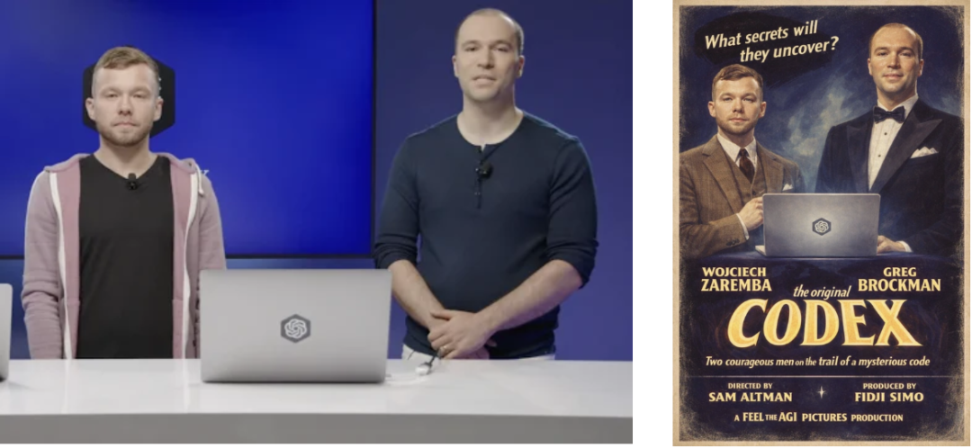 根據(jù)這兩位男士的圖片,制作一張名為《Codex》的好萊塢黃金時代電影海報。演員姓名改為Wojciech Zaremba(左)和Greg Brockman(右),由奧特曼執(zhí)導,菲吉·西莫制片,AGI影業(yè)出品。