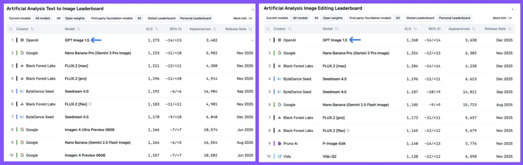 評測機構Artificial Analysis指出,GPT-Image-1.5在文本轉圖像和圖像編輯方面中均位列第一,超過Nano Banana Pro。