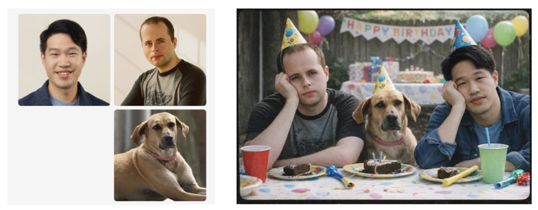 例如:生成一張2000年代膠片相機風格的照片,畫面中兩名男子和一條狗出現(xiàn)在孩子的生日派對上,神情略顯無聊。