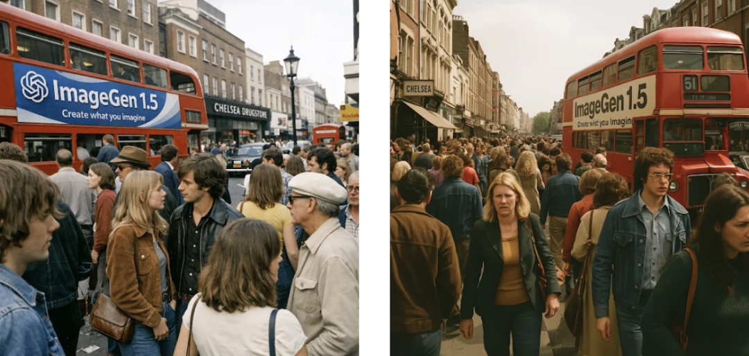 拍攝一張20世紀70年代倫敦切爾西的場景照片,畫面要逼真,所有景物清晰對焦,人群密集,還有一輛公交車,車身貼著「ImageGen 1.5」的廣告,廣告上印有OpenAI標志和「創(chuàng)造你的想象」的副標題。整體風格像業(yè)余攝影作品,iPhone快照畫質……