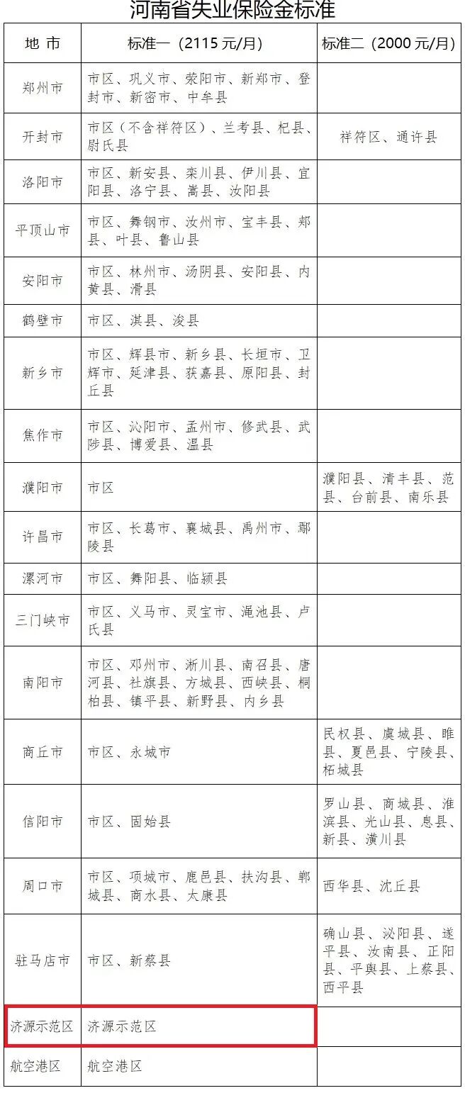 濟源示范區失業保險金最新發放標準