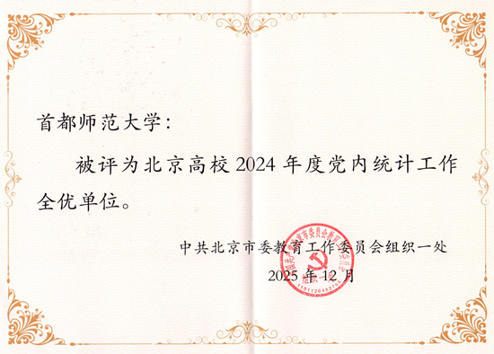 12月12日,北京市委教育工委召開2025年度黨內統計工作培訓會議,通報2024年度黨內統計工作情況。我校被評為北京高校2024年度黨內統計工作數據報表和統計分析報告全優單位,全市共有22個單位獲此榮譽。組織部副部長劉曉鑫被評為2024年度黨內統計工作優秀負責人,組織部李德云被評為數據報表和統計分析報告優秀個人。