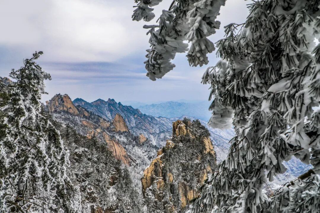 當河南的風裹著雪粒往衣領里鉆時,堯山已經偷偷把整座山裹成了軟乎乎的白絨毯 —— 青黛的峰巒蓋了厚雪被,虬枝掛著霧凇蕾絲,連石階縫里都積著蓬松的雪沫,剛一進山,連呼吸都裹著雪的清冽甜香。