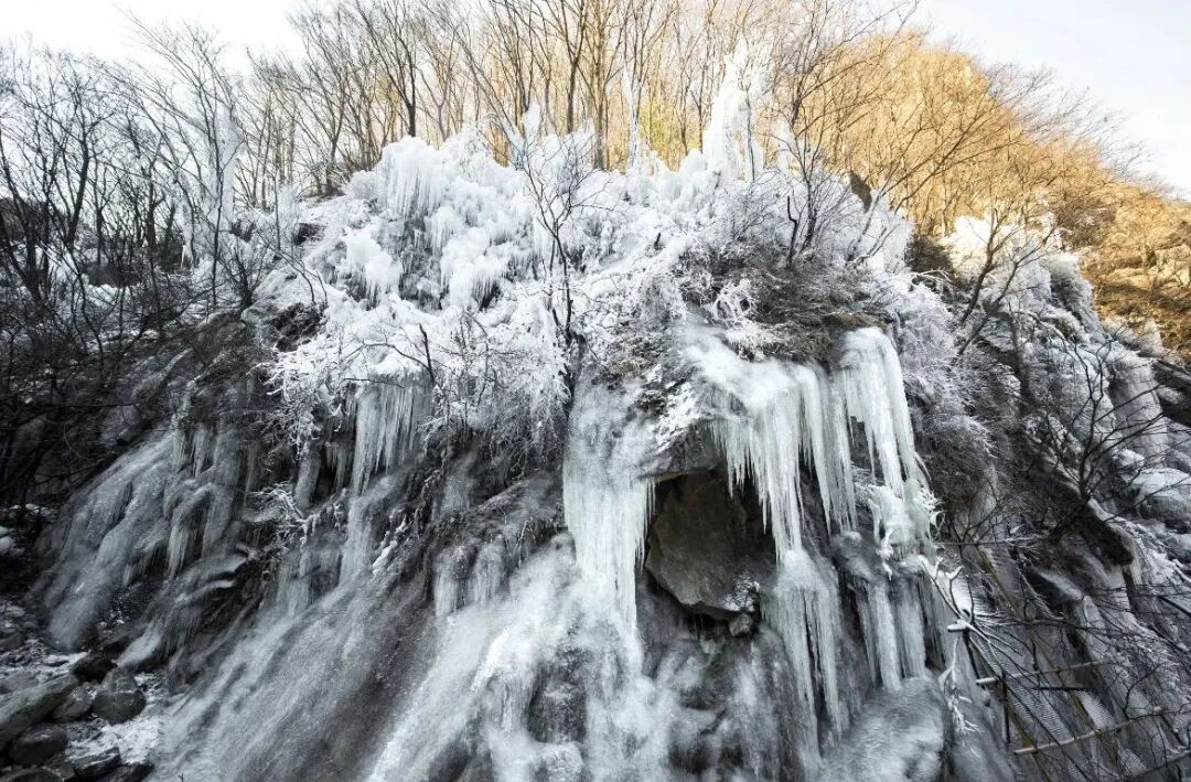 湊近主峰崖壁,還能撞見透亮的冰掛:從巖石縫里垂下來的冰柱,像水晶做的簾幕,陽光一照折射出淡藍的光 —— 伸手碰一下,涼得指尖發麻,卻忍不住想多摸兩下這冬天的「硬糖」~