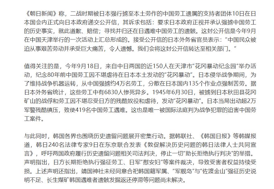 就在近日,一個(gè)中國(guó)勞工遺屬支持者團(tuán)體就向日本政府遞交了一封公開(kāi)信,要求日本政府承認(rèn)二戰(zhàn)時(shí)期強(qiáng)行擄走中國(guó)人到本土充當(dāng)勞工的事實(shí),并且歸還在日遇難中國(guó)勞工的遺骸,同時(shí)向受害者家屬道歉賠償。