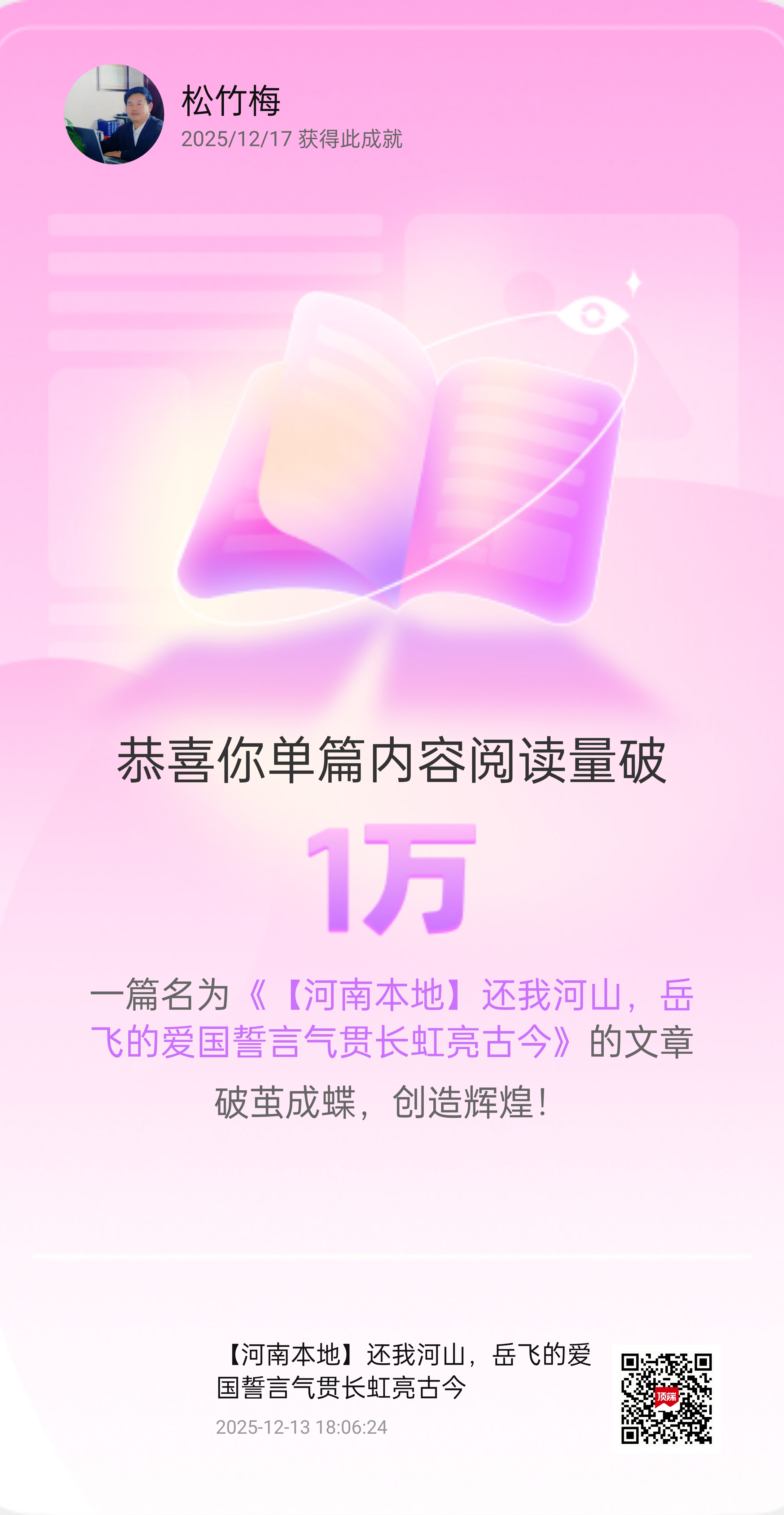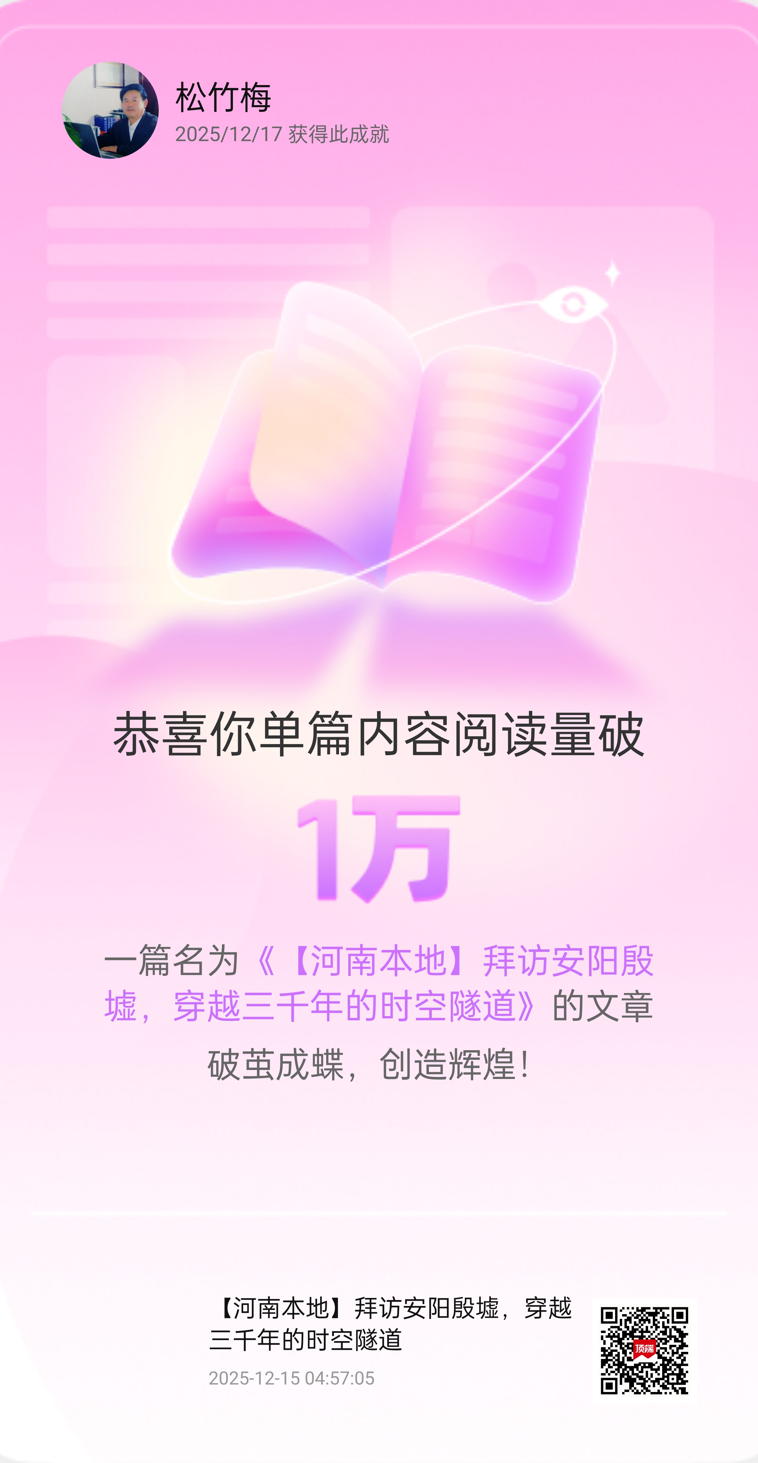 今天,又有我的兩篇拙作:《還我河山,岳飛的愛國誓言氣貫長虹亮古今》、《拜訪安陽殷墟,穿越三千年的時空隧道》,單篇閱讀量突破一萬,謝謝編輯老師,謝謝各位朋友!