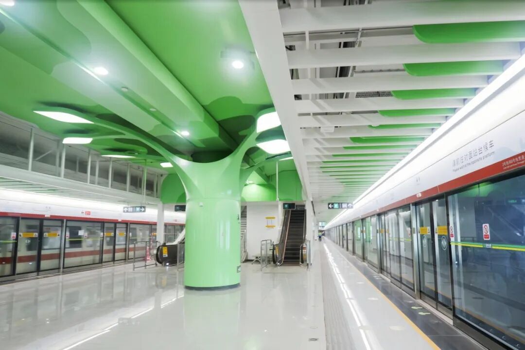 同步建設(shè)的溪涌站圍繞“陽(yáng)光+”設(shè)計(jì)理念,在山海資源豐富的自然環(huán)境基礎(chǔ)上引入“生態(tài)綠谷”概念,將古樹(shù)意象融入車站建筑結(jié)構(gòu)與燈光設(shè)計(jì),兩側(cè)墻面以遠(yuǎn)山輪廓為靈感延展空間視覺(jué),使站體與周邊生態(tài)環(huán)境自然銜接。