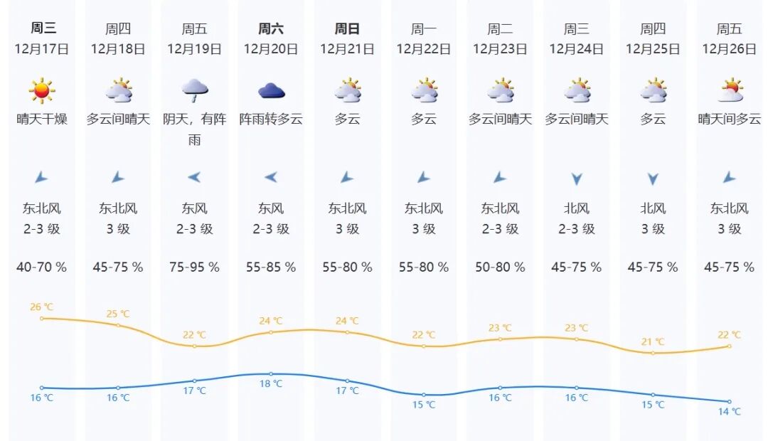 12月17日,晴天干燥;16℃-26℃;東北風2-3級;相對濕度40-70%。