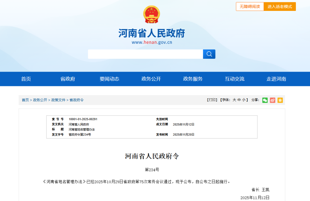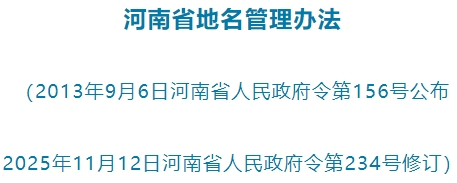 《河南省地名管理辦法》已經2025年10月29日省政府第75次常務會議通過,現予公布,自公布之日起施行。