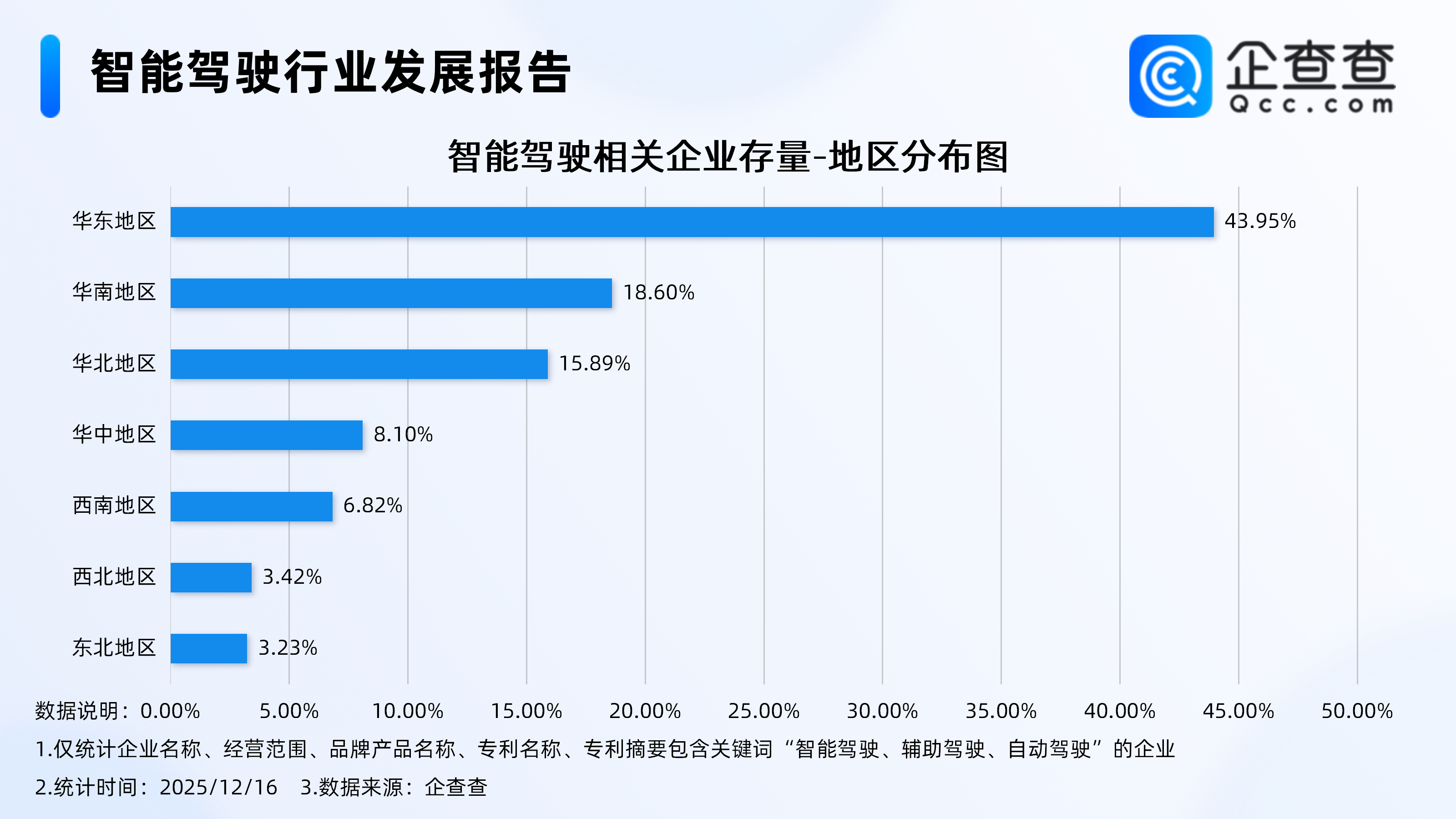企查查數(shù)據(jù)顯示,截至12月16日,國內(nèi)現(xiàn)存智能駕駛相關(guān)企業(yè)7641家。從經(jīng)營時間來看,相關(guān)企業(yè)多為老牌企業(yè),成立年限在5年以上的企業(yè)超八成,其中在10年以上的相關(guān)企業(yè)最多,占比46.21%。從注冊資本分布來看,智能駕駛相關(guān)企業(yè)多為資金密集型企業(yè),注冊資本在千萬級以上的相關(guān)企業(yè)超七成,其中在5000萬元及以上的相關(guān)企業(yè)占比43.01%。從地區(qū)分布來看,智能駕駛相關(guān)企業(yè)集中分布在華東地區(qū),占比達43.95%。注冊量方面,2024年全年注冊智能駕駛相關(guān)企業(yè)132家,截至目前,今年已注冊相關(guān)企業(yè)68家。