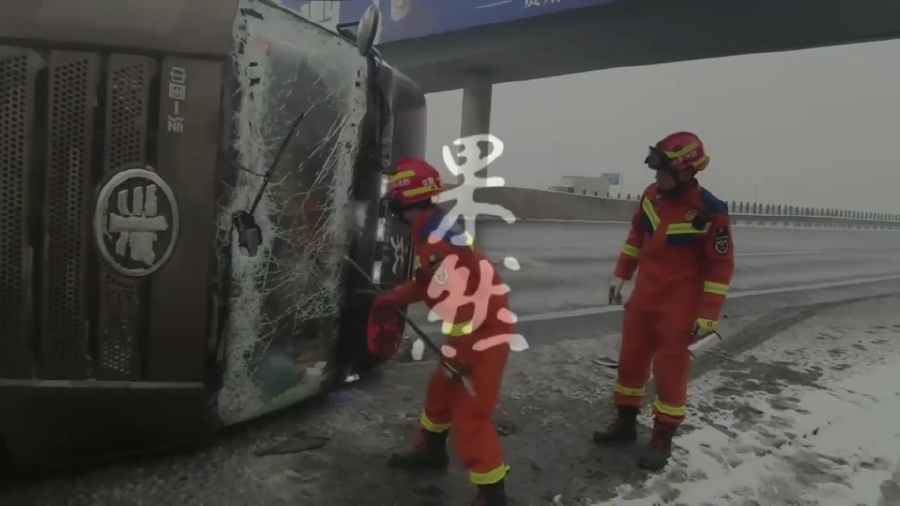 雪天路滑,一貨車在高速上失控倒翻,消防員及時(shí)救援