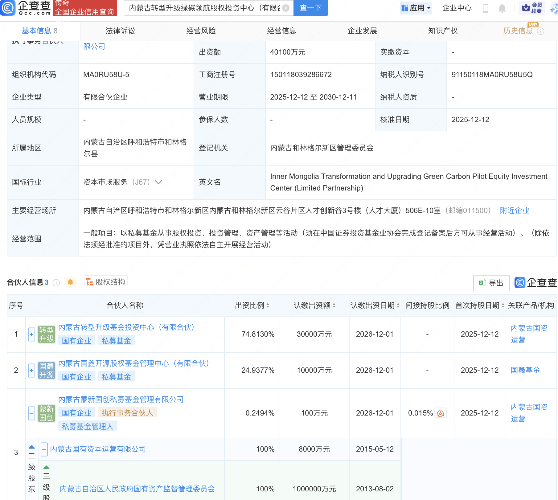 企查查APP顯示,近日,內蒙古轉型升級綠碳領航股權投資中心(有限合伙)成立,出資額4.01億元,經營范圍包含:以私募基金從事股權投資、投資管理、資產管理等活動。企查查股權穿透顯示,該企業由內蒙古蒙新國創私募基金管理有限公司等共同出資。