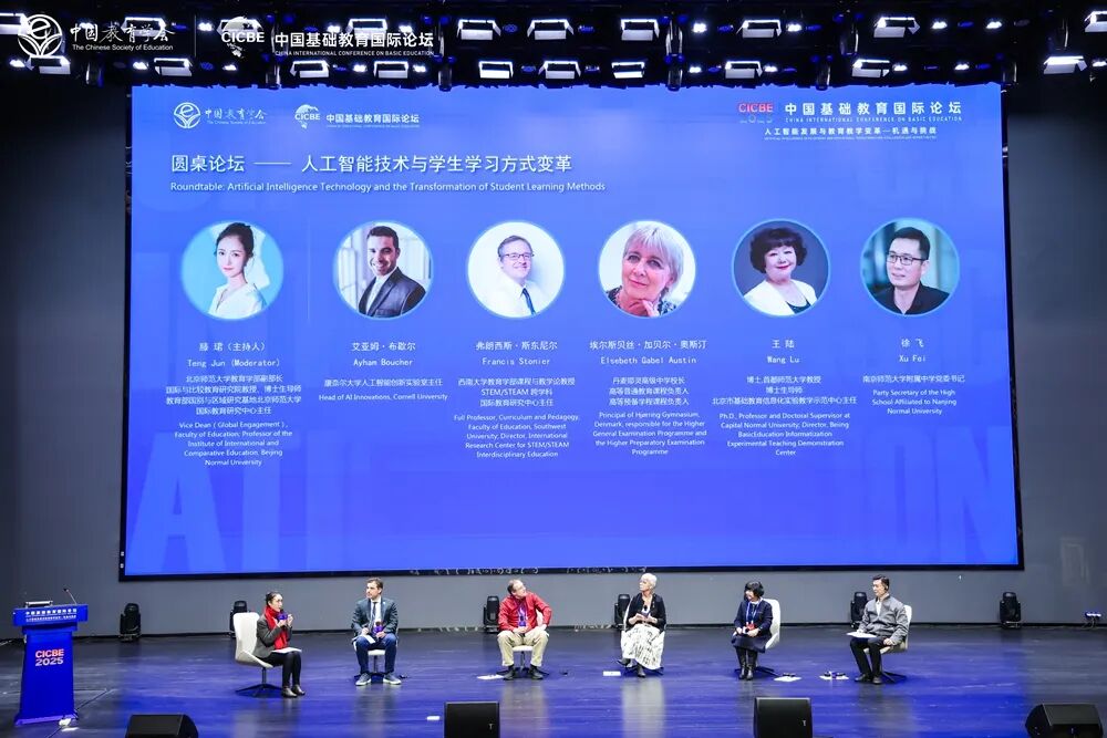 圓桌論壇環節由北京師范大學教育學部副部長、國際與比較教育研究院教授、博士生導師,教育部國別與區域研究基地北京師范大學國際教育研究中心主任滕珺主持。艾亞姆·布歇爾教授、弗朗西斯·斯東尼爾教授、埃爾斯貝絲·加貝爾·奧斯汀校長、王陸教授以及南京師范大學附屬中學黨委書記徐飛等嘉賓圍繞人工智能在教與學中的應用現狀與發展前景、值得推廣的實踐經驗、面臨的核心挑戰及解決路徑等關鍵問題進行了深入研討。嘉賓們結合中外實踐案例,各抒己見、交流碰撞,并與現場教育同仁展開互動交流,現場氛圍熱烈濃厚。
