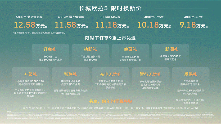 12月16日,長城汽車歐拉品牌全新A級純電SUV——長城歐拉5正式上市。新車共推出5款配置,建議零售價區(qū)間為 9.98萬至13.38萬元,限時換新價9.18萬元起(限時換新價包含“訂金禮”和“換新禮”至高5000元以舊換新補貼)。