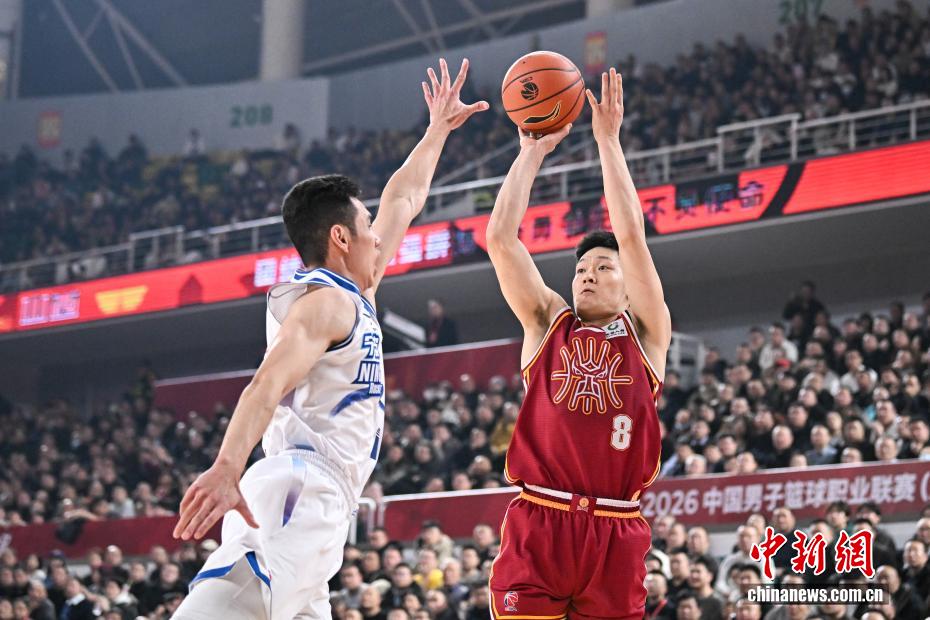 12月16日,山西隊球員張寧(紅)在比賽中投籃。當日,在太原進行的2025-2026賽季中國男子籃球職業聯賽(CBA)常規賽第2輪比賽中,山西汾酒隊主場以95比87戰勝寧波町渥隊。