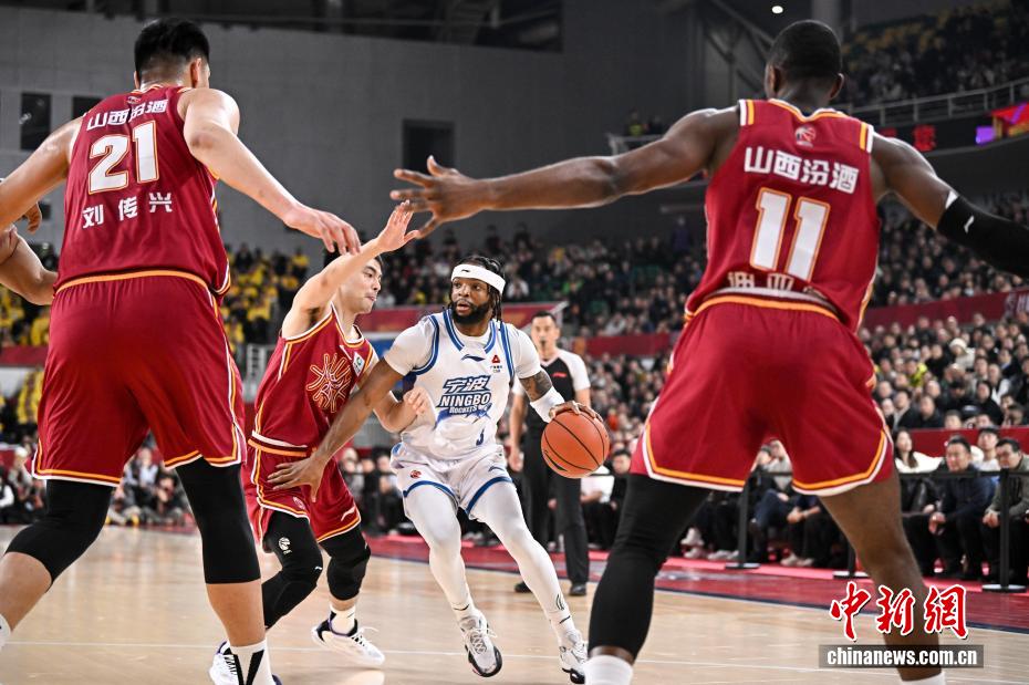 12月16日,寧波隊球員辛普森(白)在比賽中被包夾防守。當日,在太原進行的2025-2026賽季中國男子籃球職業聯賽(CBA)常規賽第2輪比賽中,山西汾酒隊主場以95比87戰勝寧波町渥隊。