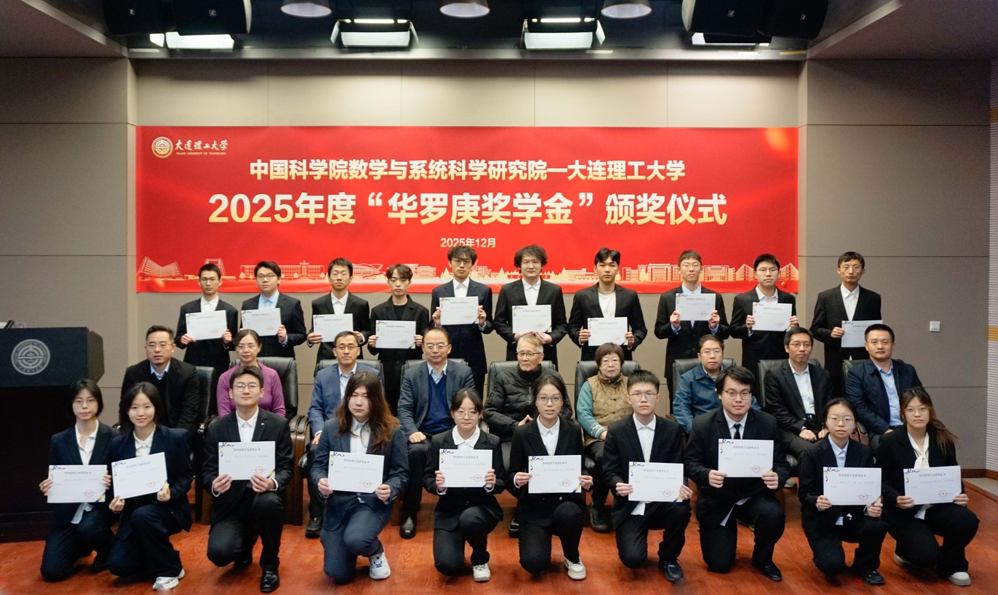 12月12日上午,中國科學院數學與系統科學研究院——大連理工大學2025年度“華羅庚獎學金”頒獎儀式在我校舉行。華羅庚先生家屬代表華光、江泳夫婦,中國科學院院士、中國科學院數學與系統科學研究院副院長戴彧虹,中國科學院數學與系統科學研究院研究生部主任劉霞,我校黨委副書記、副校長張言軍,黨委學生工作部部長、大工書院黨委書記、院長王一,教務處相關負責人,數學科學學院黨政班子成員、華羅庚班師生代表出席頒獎儀式。儀式由數學科學學院院長柳振鑫主持。