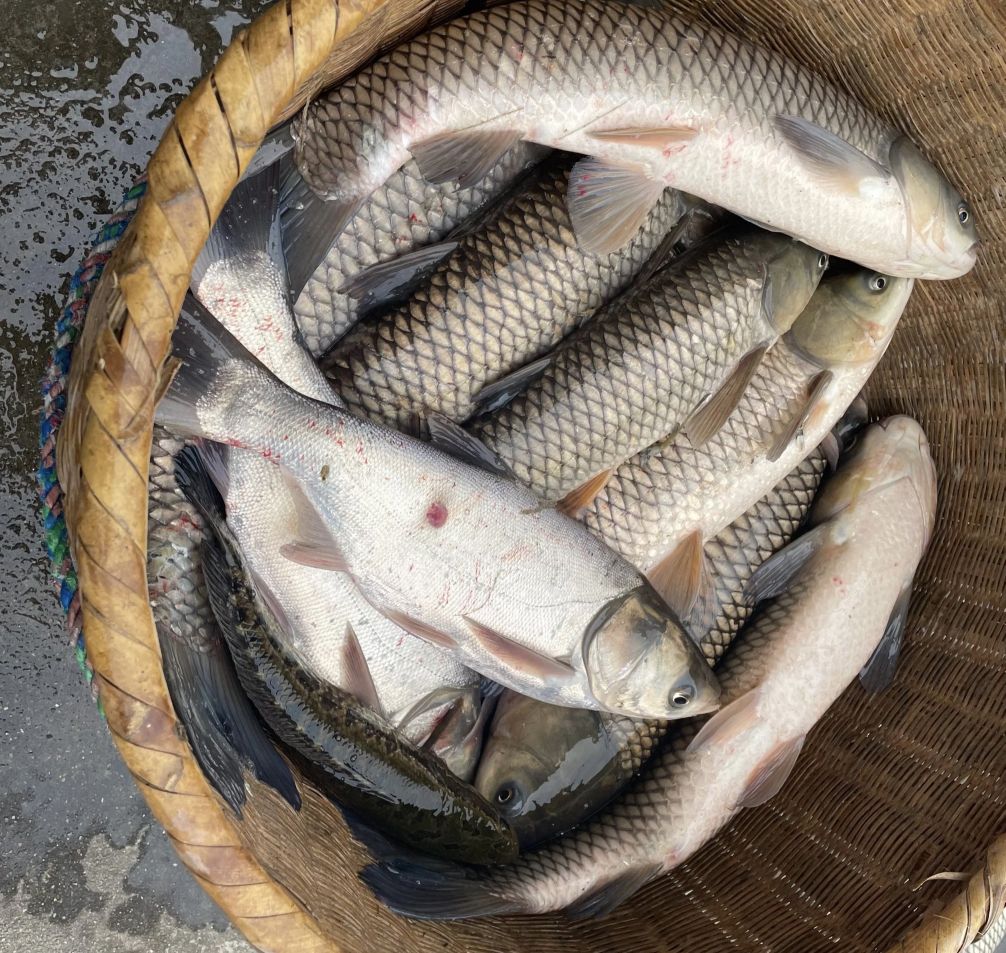 臘月的天氣,寒風有些刺骨。熱鬧的捉魚場面大約持續半個小時,留下來的魚兒會重新回到放水的魚塘里——淳樸的人們深深懂得自然萬物生生不息的道理!捉上來的魚兒,一溜兒排在場地上,翕動著腮幫子,瞪著大眼睛,看著圍成一圈兒的大人小孩,無可奈何。管事的按種類和大小分成若干份,再按照大小搭配著分給等候的“股民”。一會兒,各家歡歡喜喜用編織袋,或是竹籃,把自家的魚兒裝送回家。每到這時侯,媽媽總會慷慨而又熟練地甩幾條給站在旁邊看熱鬧的熟識鄉親,然后挑著沉甸甸的兩大袋子魚一顛一顛地回家了,再計劃著過年吃幾條,其它的都收拾干凈,用鹽腌好,來年開春慢慢吃。這幾天的房前屋后,各家都在殺魚、腌魚、曬魚。這也正應了“年年有余”的愿景吧。