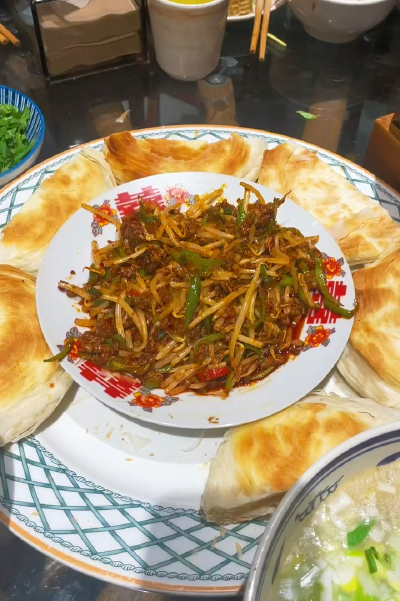 鄭州虢國羊肉湯,肉沫炒豆芽夾餅,焦脆爽口麻辣過癮