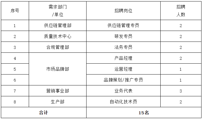 | 市場品牌部部 | 產品經理 | 1.參與市場調研、用戶分析與競品研究,協助制定產品規劃; 2.協助完成產品需求文檔編寫與功能設計; 3.協同研發、設計、運營等部門推進產品迭代與上線; 4.跟蹤產品數據,協助進行產品優化與生命周期管理。 | 2 | 碩士研究生 | 1.具備3年以上快消品或相關行業經驗,有成功產品上市案例者優先; 2.市場營銷、管理學、食品科學、經濟學等相關專業; 3.具備良好的市場洞察、邏輯思維與跨部門協調能力。 |