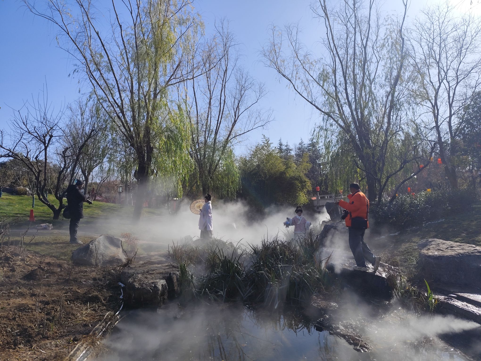 我沿著小徑,漫無目的地走。腳步落在微濕的石板上,發出輕微的、悶悶的聲響。一位頭發花白的老先生,穿著樸素的中山裝,良久,才輕輕嘆出一句:“這哪里是人造的景致,分明是把‘洛神賦’里的句子,一句一句,化在這水里霧里了。”他身旁的老伴沒有接話,只是瞇著眼,嘴角噙著一絲恍惚的笑意,仿佛整個心神,都已浸到那一片空濛的綠與白里去了。另一邊,兩個年輕的女孩子,舉著手機,試圖捕捉霧氣流散的軌跡,低聲驚嘆著:“快看那一縷,飄過去的樣子,好像有生命似的……”