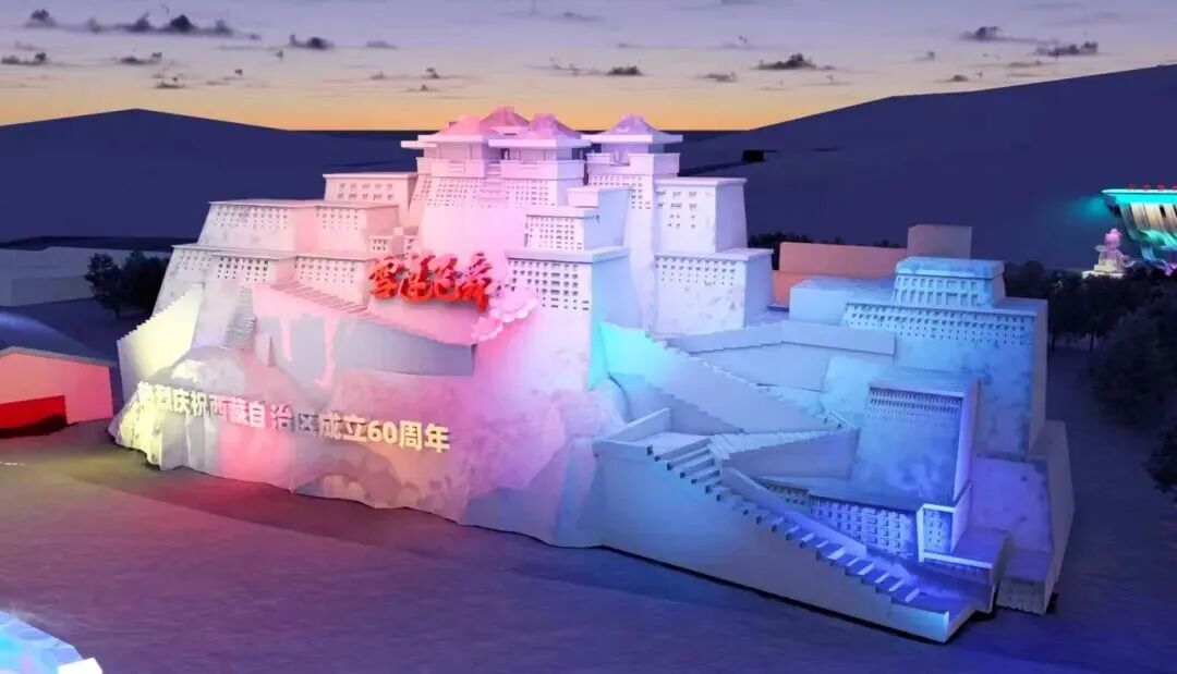 “熱烈慶祝西藏自治區成立60周年”雪雕,以布達拉宮為核心元素,盡顯西藏獨特文化魅力;