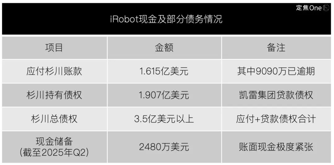 iRobot欠杉川的債務(wù)合計超過3.5億美元(應(yīng)付賬款1.615億+貸款1.907億),占其總負(fù)債的70%以上。而iRobot賬面現(xiàn)金僅剩2480萬美元,已資不抵債。